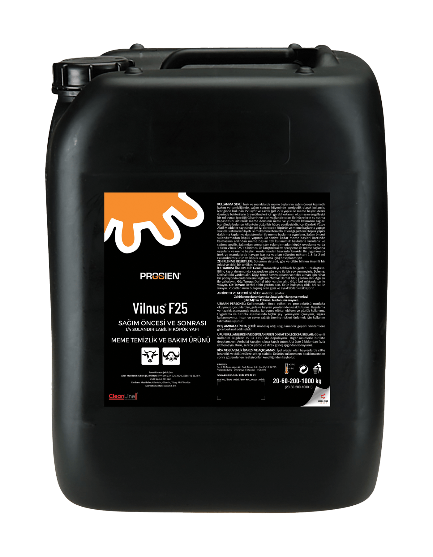 Vilnus® F25, Progien’in ürettiği sağım sonrası hijyen ürünüdür. İçeriğinde 2500 ppm aktif iyot bulunur. Köpük, sprey veya daldırma yöntemleriyle kullanılabilir. Sağım öncesi ve sonrası kullanıma uygun olup, sağım robotu sistemleriyle uyumludur. Ayrıca, bakteriyostatik etkinliği sayesinde hijyen standartlarını karşılar, güvenilir bir sağım sonrası dezenfeksiyon çözümü sunar.